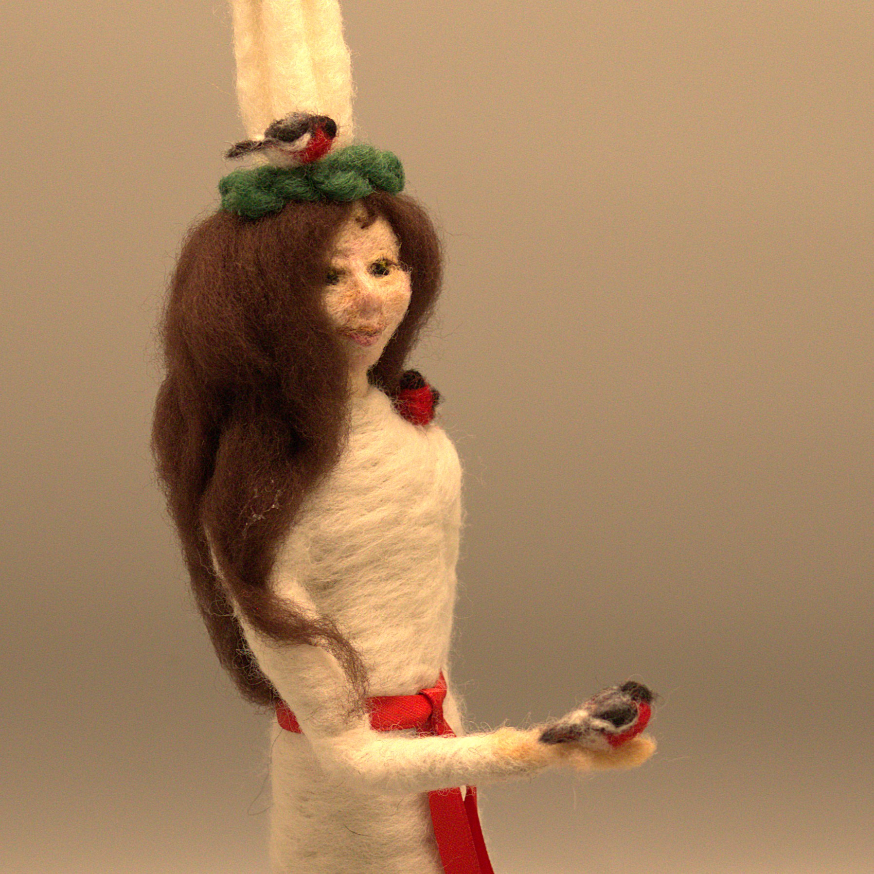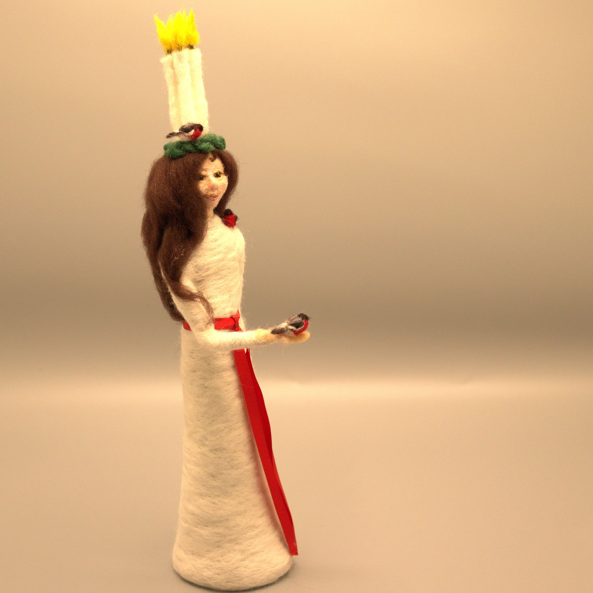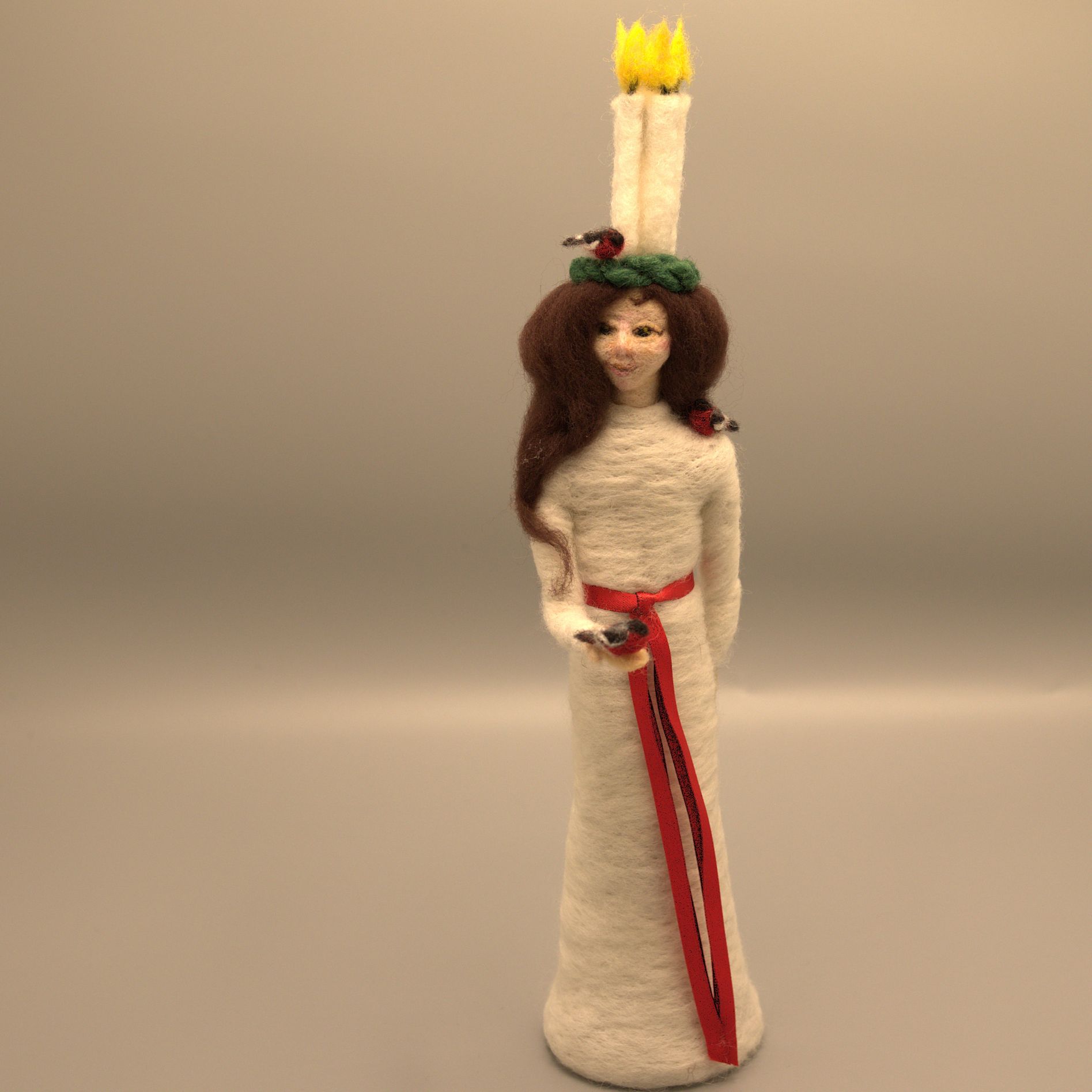 Nålfiltad lucia med ljus, en av tre i samma serie.